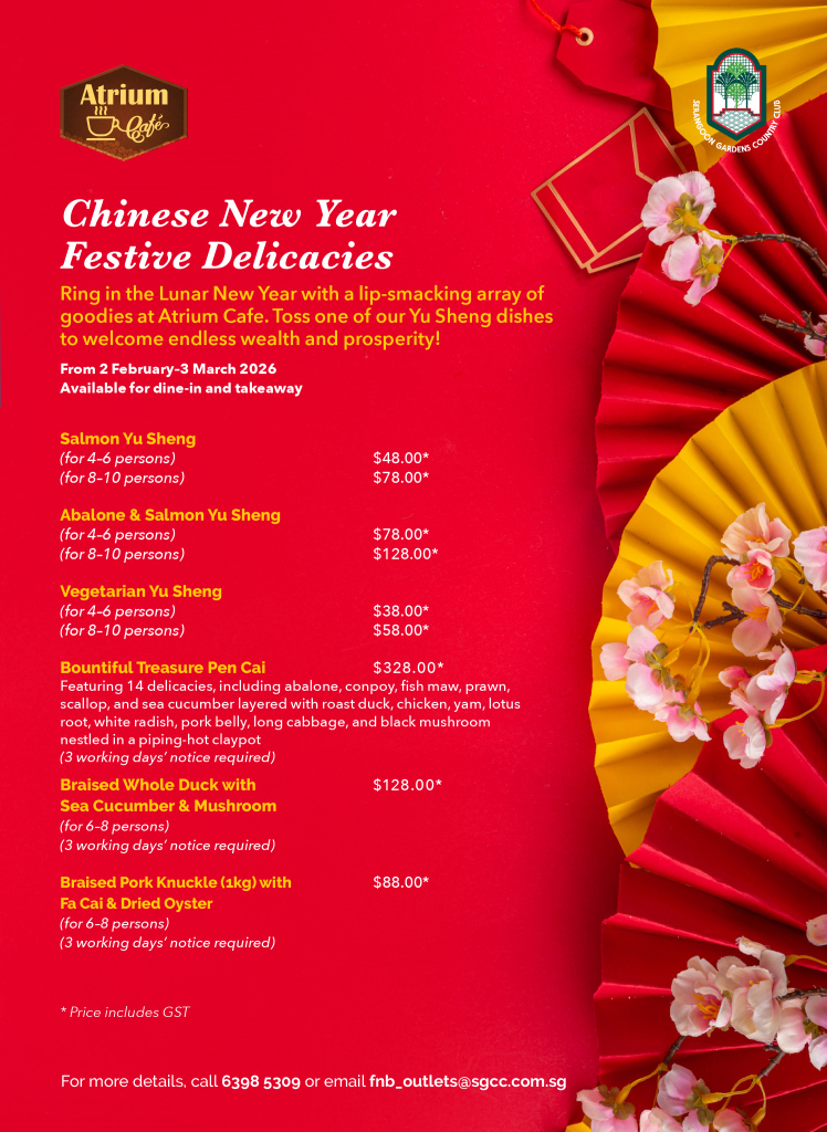 18 Dec Chinese New Year Festive Delicacies | Atrium Cafe | 2 February – 3 March 2026 Posted at 10:57h in Atrium Cafe, Dining & Entertainment, Facilities Atrium Cafe, Promotion On Going by SGCC Management Admin
