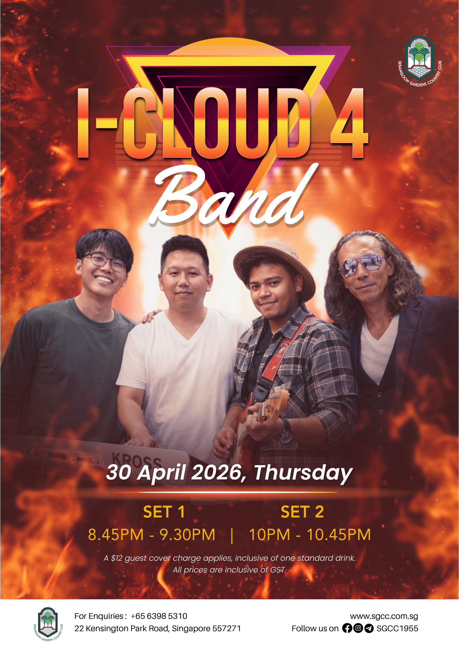 16 Apr I-CLOUD 4 Band | Crossroads | 30 April 2026 Posted at 17:29h in Crossroads Lounge, Facilities, Facilities Crossroads Lounge, Promotion On Going by SGCC Management Admin