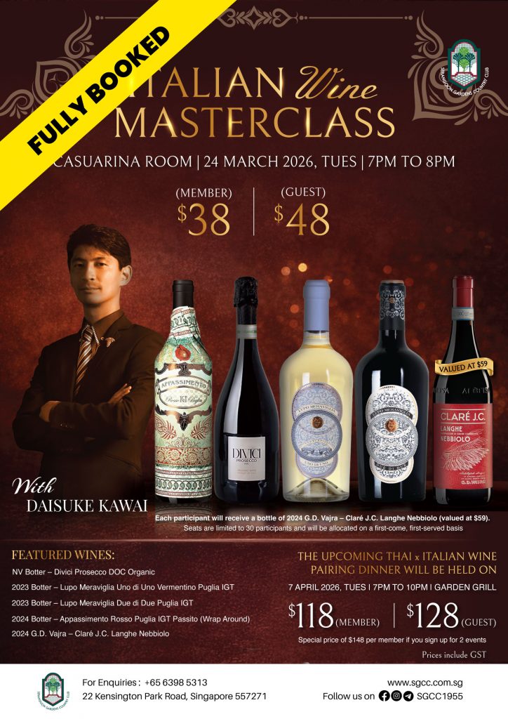 18 Mar Italian Wine Masterclass | Casuarina Room | 24 March 2026 Posted at 11:30h in Dining & Entertainment, Facilities Garden Grill, Garden Grill, Promotion On Going by SGCC Management Admin
