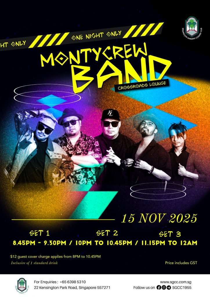 28 Oct MontyCrew Band | Crossroads | 15 November 2025 Posted at 17:27h in Crossroads Lounge, Facilities, Facilities Crossroads Lounge, Promotion On Going by SGCC Management Admin