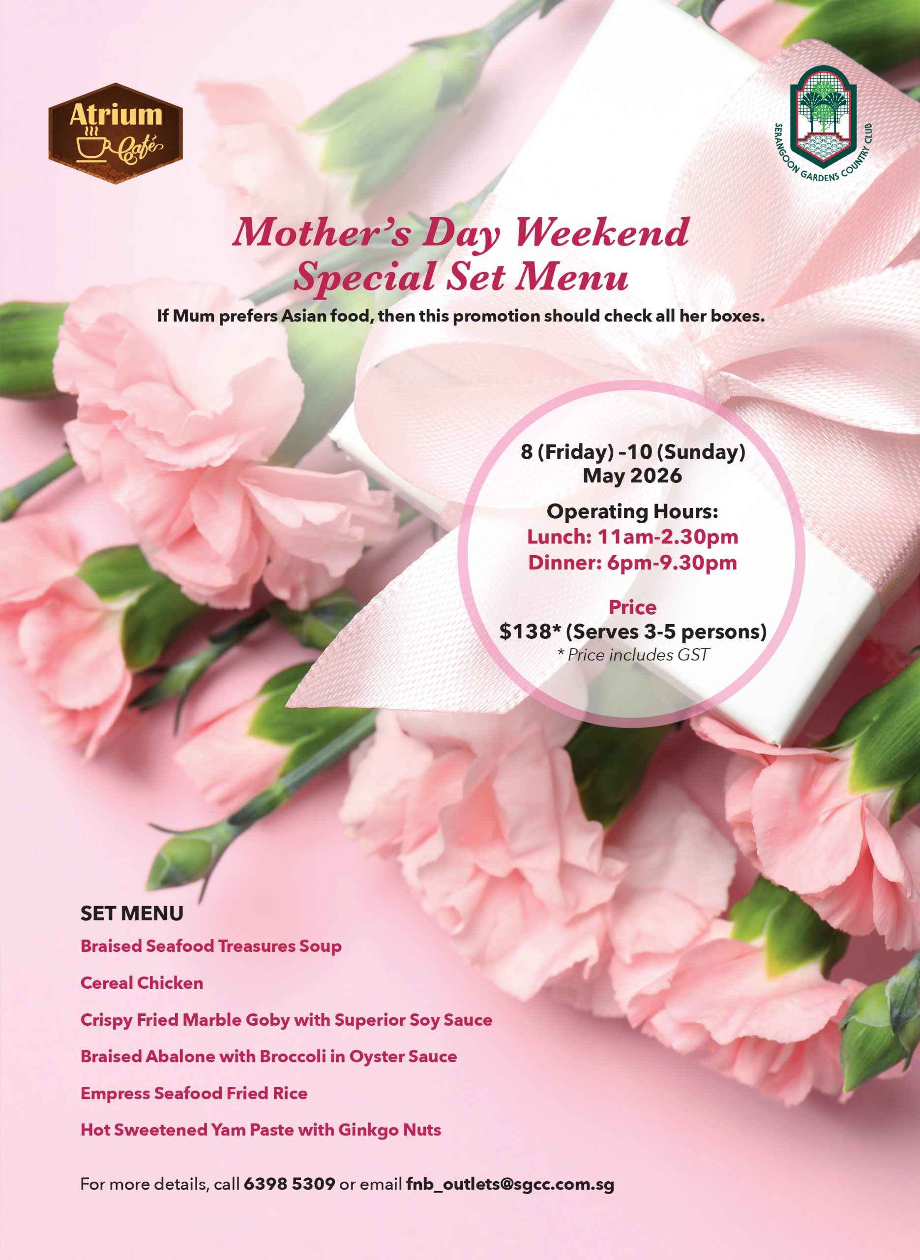 17 Mar Mother’s Day Weekend Special Set Menu | Atrium Cafe | 8 – 10 May 2026 Posted at 15:14h in Atrium Cafe, Dining & Entertainment, Facilities Atrium Cafe, Promotion On Going by SGCC Management Admin