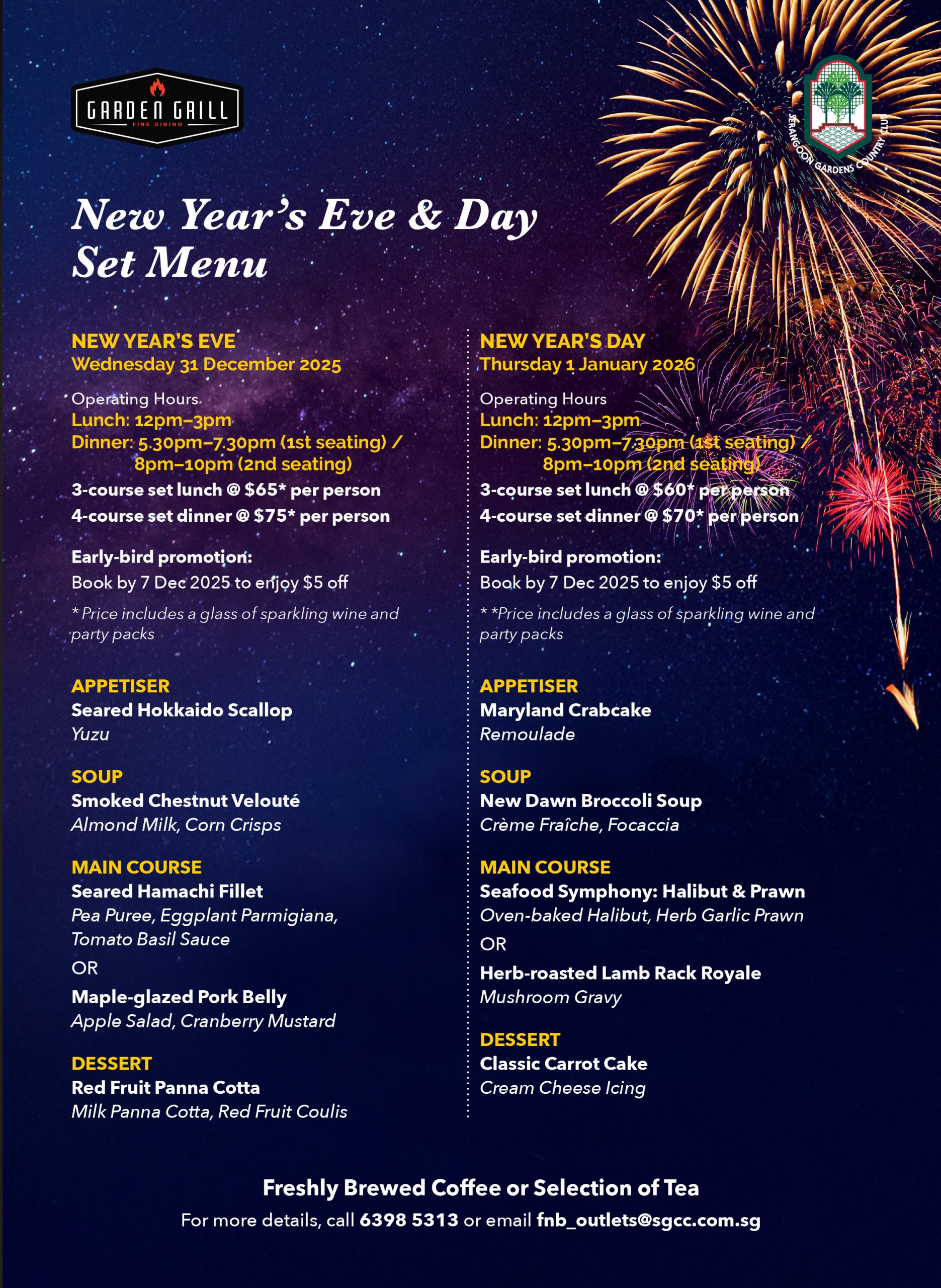 20 Nov New Year’s Eve & Day Set Menus | Garden Grill | 31 December 2025 & 1 January 2026 Posted at 18:05h in Dining & Entertainment, Facilities Garden Grill, Garden Grill, Promotion On Going by SGCC Management Admin