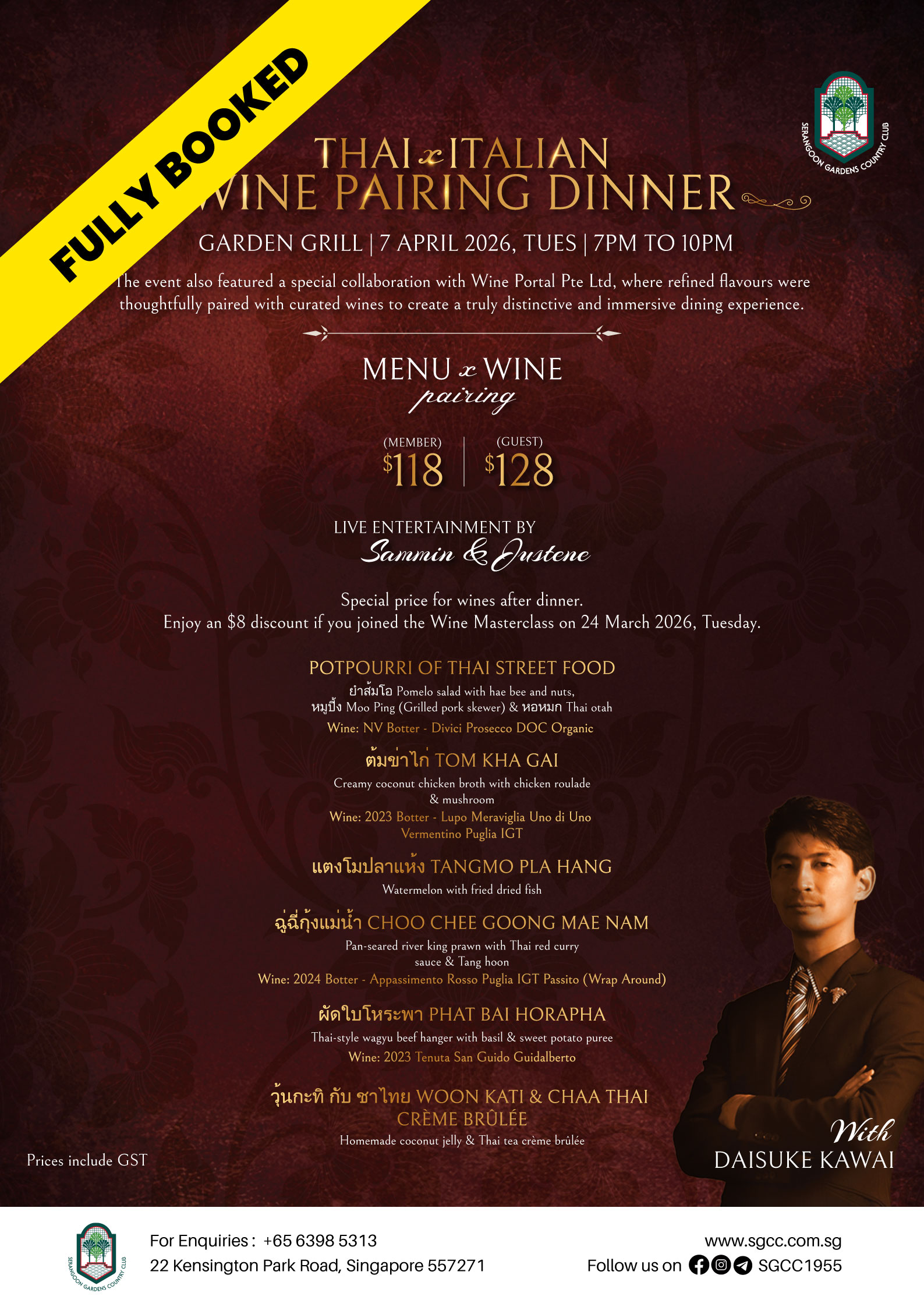 18 Mar Thai x Italian Wine Pairing Dinner | Garden Grill | 7 April 2026 Posted at 11:30h in Dining & Entertainment, Facilities Garden Grill, Garden Grill, Promotion On Going by SGCC Management Admin