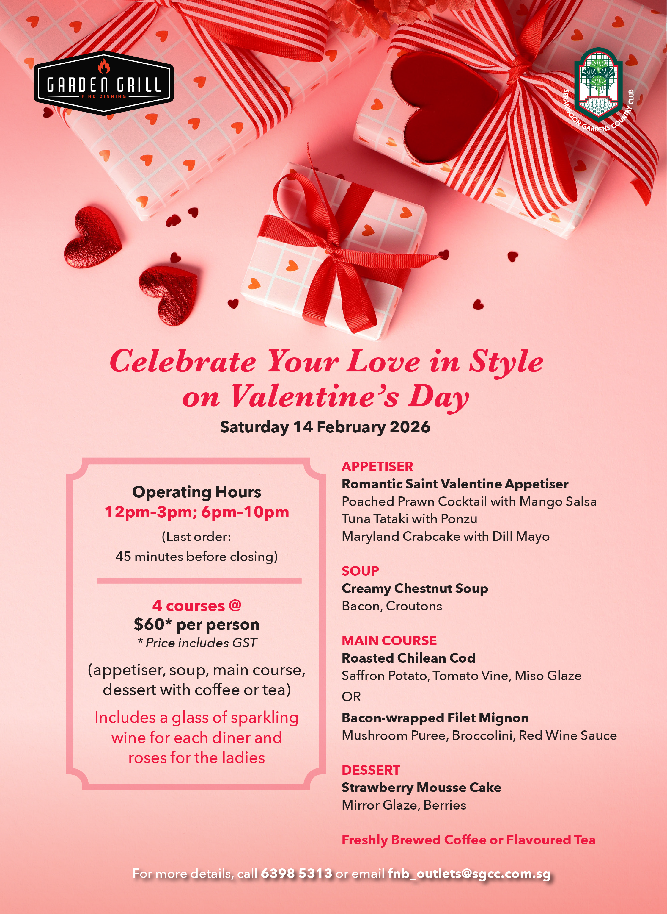 18 Dec Valentine’s Day Set Menu | Garden Grill | 14 February 2026 Posted at 11:35h in Dining & Entertainment, Facilities Garden Grill, Garden Grill, Promotion On Going by SGCC Management Admin